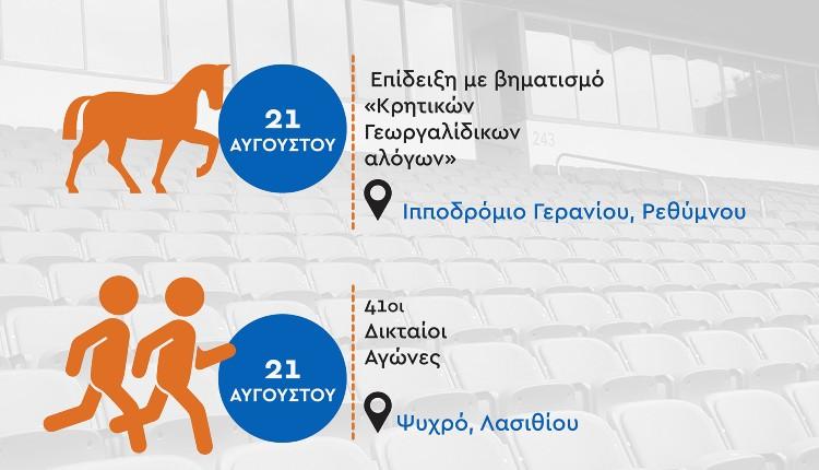 Από στις 21 Αυγούστου θα πραγματοποιηθεί στο  Ιπποδρόμιο του Γερανίου, η 21η ιππική συνάντηση «Κρητικών Γεωργαλίδικων αλόγων». Επίσης στις 21 Αυγούστου στο Ψυχρό Λασιθίου, θα πραγματοποιηθούν οι 41οι Δικταίοι Αγώνες.