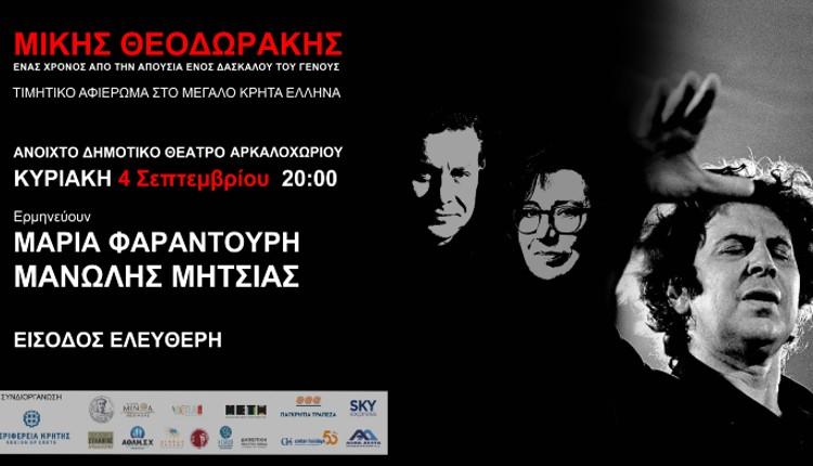 Οι δυο σπουδαίοι καλλιτέχνες, οι οποίοι έχουν σφραγίσει με τις αυθεντικές ερμηνείες τους τα τραγούδια του Μίκη Θεοδωράκη, θα δώσουν μια μοναδική συναυλία στο Ανοιχτό Δημοτικό Θέατρο Αρκαλοχωρίου, την Κυριακή 4 Σεπτεμβρίου, στις 8:00 μ.μ.