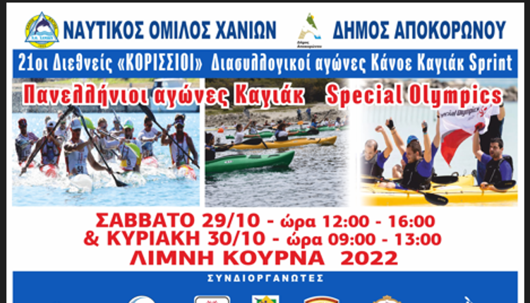 Η Περιφέρεια Κρήτης – Περιφερειακή Ενότητα Χανίων, ο Δήμος Αποκορώνου, η Ελληνική Ομοσπονδία Κάνοε Καγιάκ, ο Ναυτικός Όμιλος Χανίων, τα Special Olympics Hellas και ο Σύλλογος Γονέων και Κηδεμόνων του Ν.Ο.Χ., συνδιοργανώνουν τους 21 ους Διεθνείς “Κορίσσιους” Διασυλλογικούς αγώνες Κάνοε Καγιάκ Σπρίντ και τους Πανελλήνιους Αγώνες Special Olympics Καγιάκ, που θα πραγματοποιηθούν το Σάββατο 29 και την Κυριακή 30 Οκτωβρίου 2022 στη Λίμνη του Κουρνά, του Δήμου Αποκορώνου.