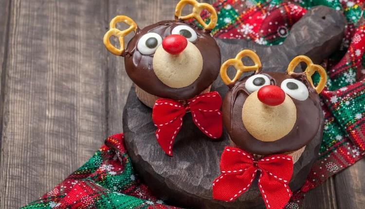 Με την ίδια λογική, μπορείτε να φτιάξετε μάφιν, να τα καλύψετε με σοκολάτα και να σχηματίσετε πάνω τους με τα ίδια υλικά την όψη του ταράνδου.