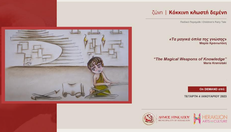 Το παιδικό παραμύθι «Τα μαγικά όπλα της γνώσης» της συγγραφέως Μαρίας Κρανιώτακη είναι πλέον διαθέσιμο, on demand, στο κανάλι πολιτισμού του Δήμου Ηρακλείου – Heraklion Arts and Culture, στη Ζώνη θέασης «Κόκκινη Κλωστή Δεμένη» και στον σύνδεσμο: