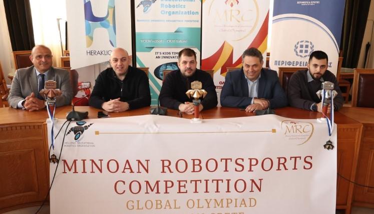 Το πρωί της Παρασκευής 31 Μαρτίου πραγματοποιήθηκε στην αίθουσα συνεδριάσεων του Δημοτικού Συμβουλίου Ηρακλείου η κεντρική συνέντευξη τύπου της Ολυμπιάδας Ρομποτικής “MINOAN ROBOTSPORTS COMPETITION GLOBAL OLYMPIAD 2023”, παρουσία του Προέδρου του Ελληνικού Οργανισμού Εκπαιδευτικής Ρομποτικής Μανόλη Βελιδάκη, του Αντιδημάρχου Κυκλικής Οικονομίας Περιβάλλοντος και Αθλητισμού Κώστα Βαρδαβά, του Αντιπεριφερειάρχη Αθλητισμού Πρόληψης και Κινητών Μονάδων Γιώργου Πιτσούλη ,του Αντιπεριφερειάρχη Τουρισμού και Ηλεκτρονικής Διακυβέρνησης Κυριάκου Κώτσογλου, καθώς και του πρόξενου της τιμώμενης χώρας του διαγωνισμού Ρουμανίας Κώστα Κουρκουνάκη.