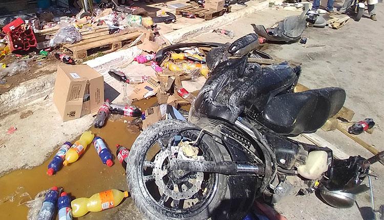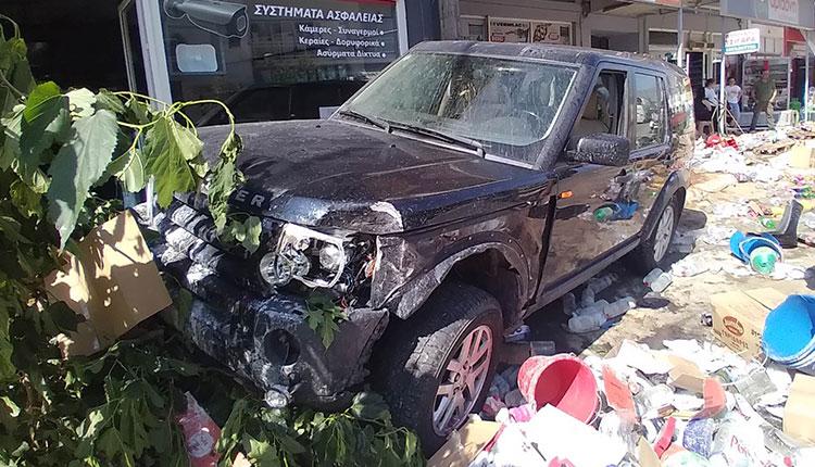 Αυτοκίνητο κατευθυνόμενο προς Μοίρες ξέφυγε από την πορεία του, ανέβηκε πάνω στο πεζοδρόμιο ενός σούπερ μάρκετ, χτύπησε αυτοκίνητο και μια μηχανή και γενικά παρέσυρε ότι βρήκε μπροστά του μέχρι να σταματήσει.