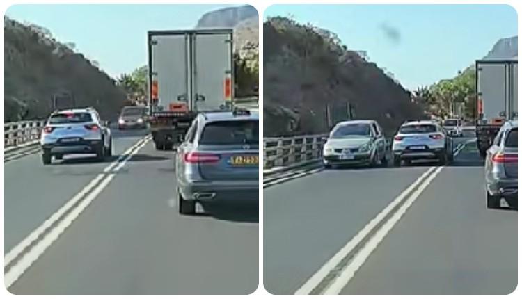 Οδηγός Ι.Χ. φαίνεται να παραβιάζει τη διπλή διαχωριστική γραμμή, πραγματοποιώντας αλλεπάλληλες προσπεράσεις και περνώντας στο αντίθετο ρεύμα κυκλοφορίας. Σε μία από τις κινήσεις του μάλιστα φτάνει μια ανάσα από μετωπική σύγκρουση με άλλο όχημα, η οποία αποφεύχθηκε χάρη στην ψύχραιμη αντίδραση του απέναντι οδηγού που πρόλαβε να φρενάρει.
