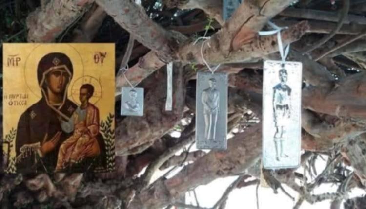 Αμέτρητα τάματα κρεμασμένα στην αιωνόβια μυρτιά κινούνται με τον άνεμο, συμβολίζοντας την πίστη και την ελπίδα των πιστών