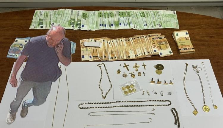 Στην κατοχή του βρέθηκαν και κατασχέθηκαν 34.610 ευρώ και κοσμήματα αξίας 30.000 ευρώ, ενώ σε χώρο που χρησιμοποιούσε βρέθηκαν επιπλέον 4.000 ευρώ, τα οποία κατασχέθηκαν.