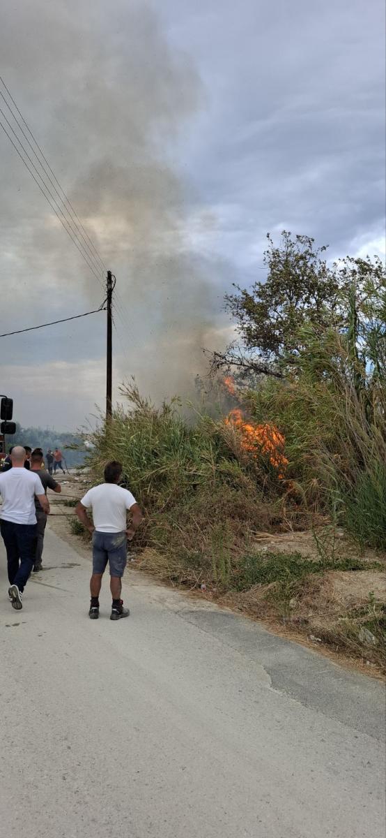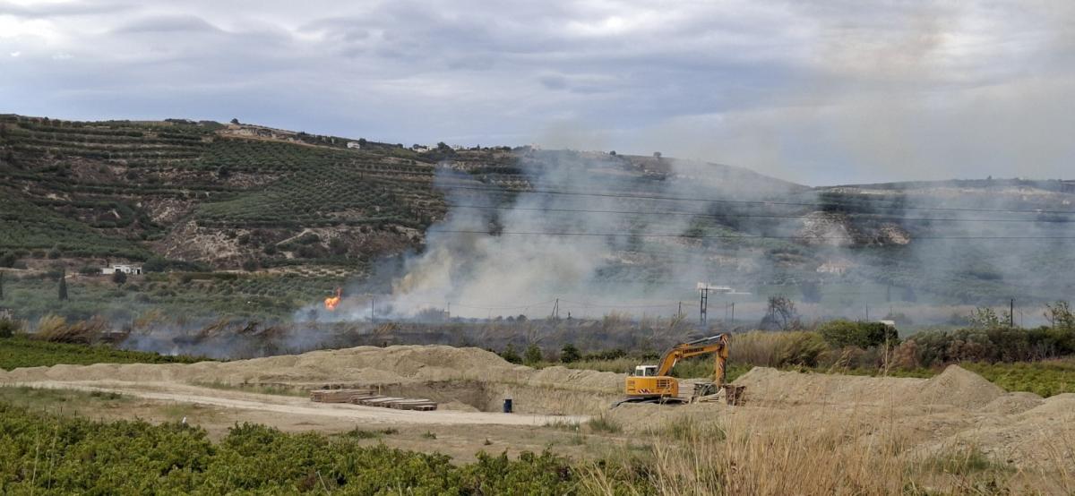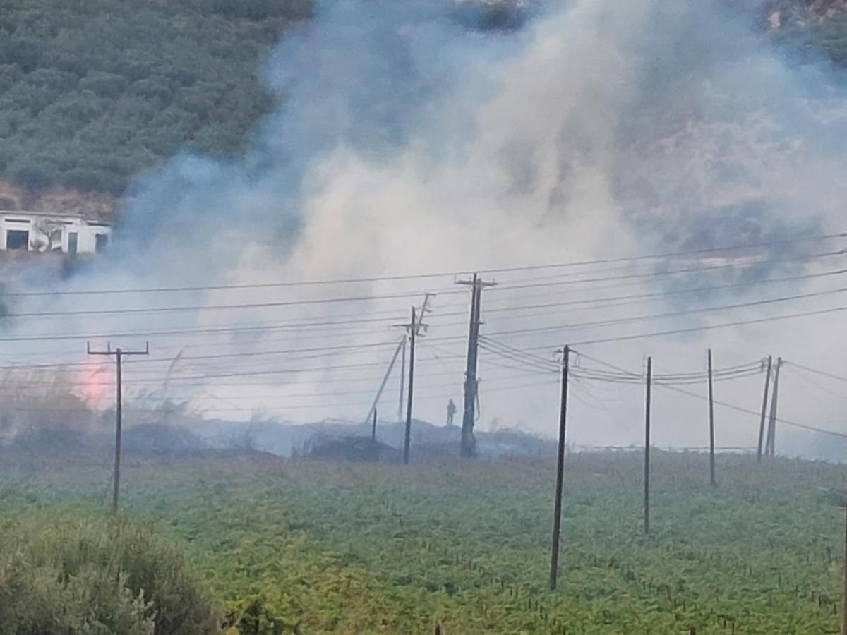 Οι φλόγες καίνε καλαμιές και η εξάπλωση του μετώπου δυσχεραίνεται από τους ισχυρούς ανέμους, οι οποίοι γίνονται αισθητοί σε πολλά σημεία του Ηρακλείου.