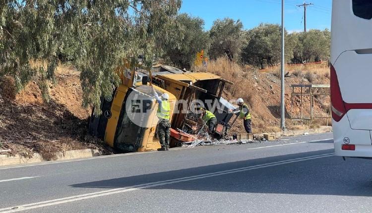 Γερανός της Τεχνικής εταιρείας που κατασκευάζει τον αυτοκινητόδρομο, τούμπαρε πριν από λίγα λεπτά, στο ύψος της παράκαμψης των Λιμνών, σύμφωνα με την ΕΡΤ.