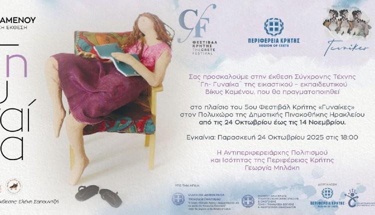 «Γη-Γυναίκα», είναι ο τίτλος της ατομικής έκθεσης της Βίκυς Καμένου, που θα παρουσιαστεί στη Δημοτική Πινακοθήκη Ηρακλείου (οδό Χρυσοστόμου 8) από τις 24/10/2025 έως τις 14/11/2025 στο πλαίσιο της παράλληλης δράσης του 5ου Φεστιβάλ Κρήτης «Γυναίκες», που υλοποιείται για 2η συνεχόμενη χρονιά, με την υποστήριξη του Αυτοτελούς Γραφείου Ισότητας της Περιφέρειας Κρήτης. Την επιμέλεια της έκθεσης υπογράφει η ιστορικός τέχνης Ελένη Σαπουντζή. Τα επίσημα εγκαίνια θα πραγματοποιηθούν την Παρασκευή 24 Οκτωβρίου 2025 και ώρα 18.00.