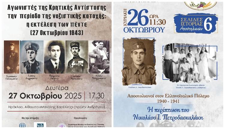 Η πρώτη εκδήλωση θα πραγματοποιηθεί στους Αποστόλους Πεδιάδος, την Κυριακή 26 Οκτωβρίου, στις 11:30 π.μ., στην Αίθουσα ψυχαγωγίας – καφενείο Μανόλη Μανωλαράκη. Τη διοργάνωση έχει αναλάβει ο Πολιτιστικός Σύλλογος Αποστολιανών, με θέμα: «Αποστολιανοί στον Ελληνοϊταλικό Πόλεμο. Η περίπτωση του Νικολάου Ι. Πετροδασκαλάκη». Η εκδήλωση είναι αφιερωμένη στη συμμετοχή των Αποστολιανών στον Ελληνοϊταλικό Πόλεμο, ενώ θα γίνει ειδική αναφορά στη ζωή και τη δράση του Νικολάου Ι. Πετροδασκαλάκη, φωτίζοντας πτυχές της προσωπικότητάς του και της προσφοράς του στην πατρίδα.