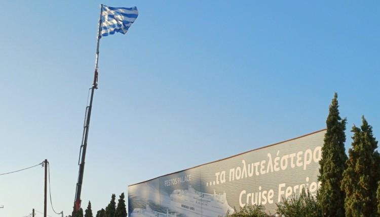 Μια εντυπωσιακή ελληνική σημαία σε ύψος 28 μέτρων υψώθηκε στην είσοδο του Τυμπακίου, στη μάντρα “Αφοί Κουρτάκη”, με αφορμή την εθνική επέτειο της 28ης Οκτωβρίου.