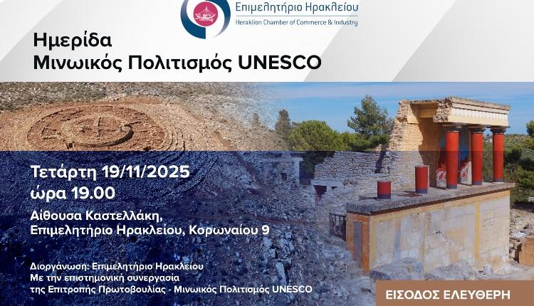 Το Επιμελητήριο Ηρακλείου σας προσκαλεί στην Ημερίδα με θέμα " Μινωικός Πολιτισμός UNESCO" την Τετάρτη 19/11/2025 και ώρα 19.00 στην αίθουσα Καστελλάκη (Επιμελητήριο Ηρακλείου, Κορωναίου 9).