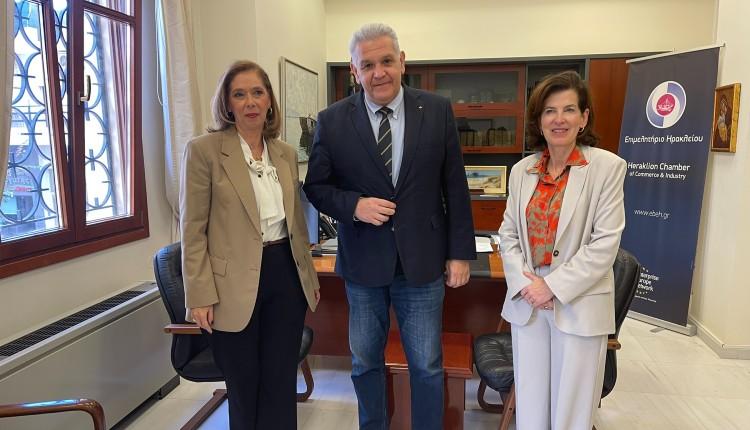 Έντονο ενδιαφέρον για συνεργασία γαλλικών επιχειρήσεων με καινοτόμες και νεοφυείς επιχειρήσεις τεχνολογίας της Κρήτης εκδήλωσε η Πρέσβειρα της Γαλλίας στην Αθήνα κα Laurence Auer κατά τη συνάντησή της με τον Πρόεδρο του Επιμελητηρίου Ηρακλείου κ. Βαγγέλη Καρκανάκη.