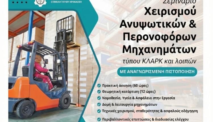 Πιστοποιημένο πρόγραμμα εκπαίδευσης στον χειρισμό ανυψωτικών περονοφόρων μηχανημάτων (Κλαρκ) για τις κατηγορίες 2.7 & 2.8 παρέχει το ΚΕΚ ΤΕΧΝΙΚΕΣ ΣΧΟΛΕΣ του Επιμελητηρίου Ηρακλείου, με Αναγνωρισμένη Πιστοποίηση για την Περιφέρεια και το Υπ. Ανάπτυξης. (ΦΕΚ Β 3350 – 12/6/2024).
