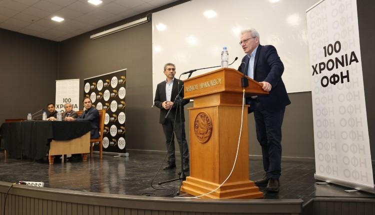 Ο Δήμαρχος Ηρακλείου, μιλώντας στην αίθουσα «M. Kαρέλης», παρουσία του Αντιπροέδρου της ΠΑΕ ΟΦΗ Ηλία Πουρσανίδη, στελεχών της ομάδας, του Πρόεδρου του Δ.Σ. των ΕΛΤΑ Δανιήλ Μπεναρδούτ και του Αντιδημάρχου Άθλησης & Αθλητισμού Γιάννη Τσαπάκη και του Αντιδημάρχου Προγραμματισμού & Ψηφιακού Μετασχηματισμού Τάσου Τσατσάκη, αναφέρθηκε στους άρρηκτους δεσμούς του ΟΦΗ με την πόλη και την κοινωνία της, επισημαίνοντας: «Χρόνια πολλά στον ΟΦΗ μας. Είναι τέτοιες οι ημέρες οι οποίες συνδυάζονται με μια εορταστική διάθεση που ξυπνάει σε ότι αφορά ειδικά τον ΟΦΗ και πολύ εύκολα και αυθόρμητα εκδηλώνεται και έχει ήδη εκδηλωθεί. Θα το δούμε σε όλη τη σημερινή ημέρα που είναι η ημέρα της επίσημης σύνδεσης του Σωματείου με την πόλη, σαν σήμερα, πριν από 100 χρόνια. Αυτό δημιουργεί σε όλους μας μια ιδιαίτερη συγκίνηση. Από την πλευρά της πόλης αυτό που έχει ιδιαίτερη σημασία είναι η κοινωνική ρίζα του ΟΦΗ. Ο ΟΦΗ ιδρύθηκε από ανθρώπους της πόλης εκείνη τη μεταβατική εποχή για την Κρήτη, για το Ηράκλειο και για τη χώρα. Ήταν άνθρωποι που εκπροσωπούσαν την κοινωνία συνολικά. Ανάμεσα τους ήταν άνθρωποι από μια εργατική βάση αλλά και νέοι άνθρωποι. Άλλωστε η διάσταση την οποία πήρε ο ΟΦΗ εξαρχής είχε αυτό το κοινωνικό πρόσημο που το διατήρησε σε όλη την πορεία. Το θεωρώ πάρα πολύ σημαντικό για τη σχέση αυτού του Συλλόγου που είχε τη λέξη φίλαθλος εξαρχής και φυσικά την διατηρεί και σήμερα. Ο ΟΦΗ στις γειτονιές, ως μια ενθάρρυνση, ένα παράδειγμα και μια αφετηρία για την ενασχόληση με τον αθλητισμό. Όπως και η διάσταση του γυναικείου αθλητισμού από πάρα πολύ νωρίς, όταν δεν ήταν καθόλου αυτονόητο. Αυτό έγινε με τον ΟΦΗ, μαζί με όλα τα υπόλοιπα αθλήματα που περιλαμβάνουν το στίβο, το μπάσκετ κ.α. Επίσης υπάρχει και η ποδοσφαιρική διάσταση. Είναι φυσικό να προβάλλεται περισσότερο αυτή η ομάδα που έχει τον χαρακτήρα της ΠΑΕ και οργανώνει σήμερα αυτή την εκδήλωση.