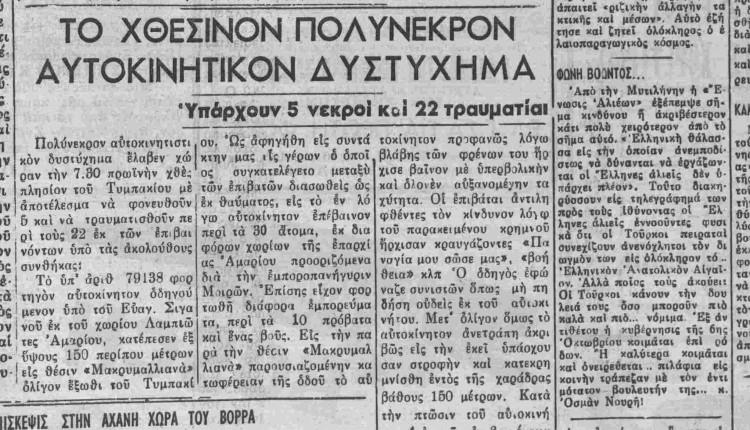 Πολύνεκρον αυτοκινητιστικόν δυστύχημα έλαβεν χώραν την 7.30 πρωϊνήν χθες πλησίον του Τυμπακίου με αποτέλεσμα να φονευθούν 5 και να τραυματισθούν περί τους 22 εκ των επιβαινόντων υπό τας ακολούθους συνθήκας :