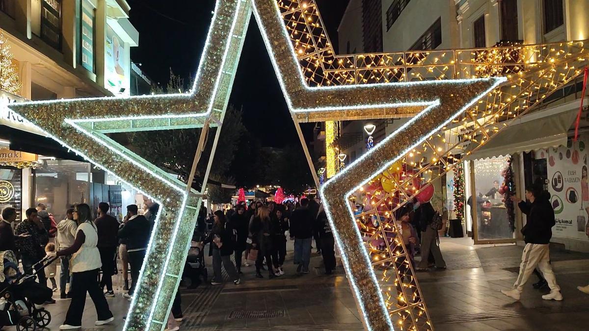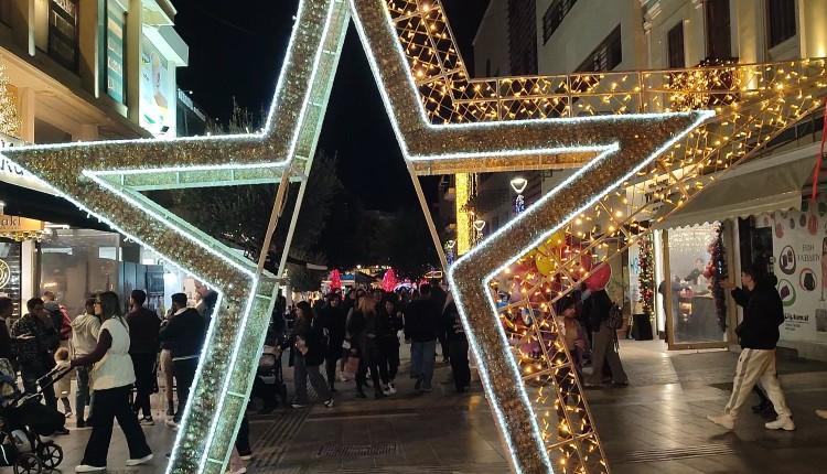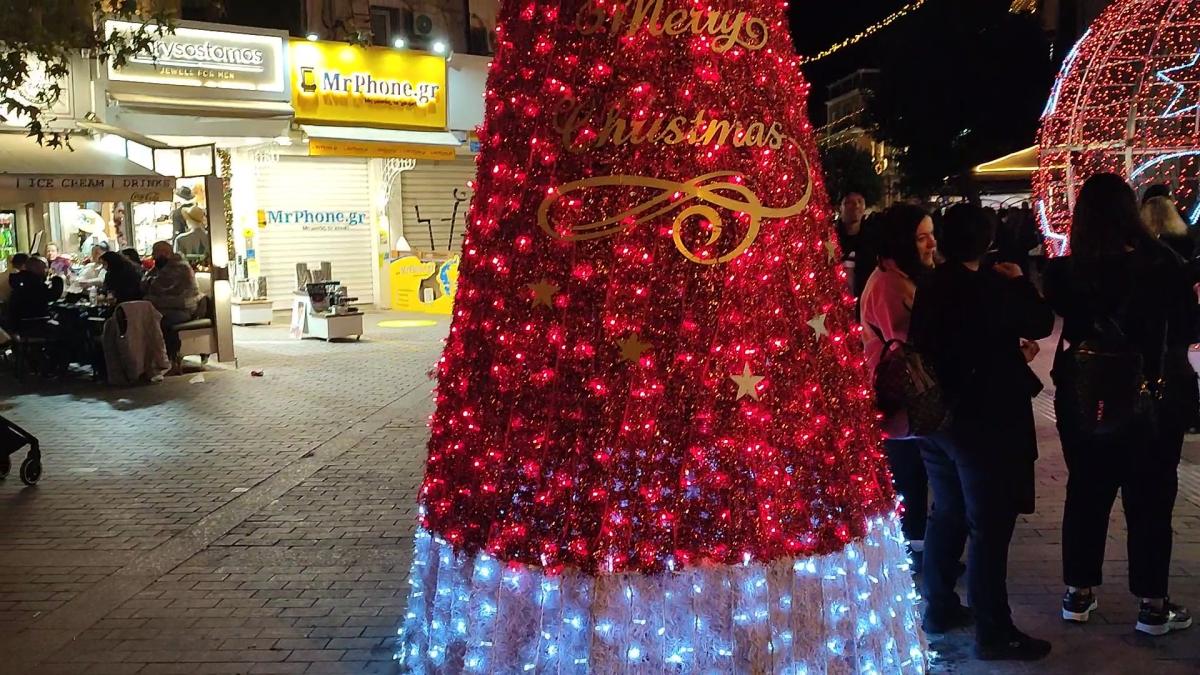 Στην είσοδο της πλατείας δεσπόζει ένα φωτεινό αστέρι, πλαισιωμένο από ένα κόκκινο με λευκό χριστουγεννιάτικο δεντράκι, ενώ ιδιαίτερη εντύπωση προκαλεί ένα πλεκτό διακοσμητικό σε σχήμα μπαλονιού, που προσθέτει μια χειροποίητη και ζεστή αισθητική στο σύνολο. Τα στοιχεία αυτά συνθέτουν μια εικόνα απλή, αλλά προσεγμένη, που απευθύνεται σε όλες τις ηλικίες.