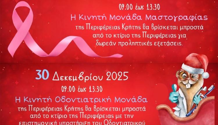 Η πρόληψη αποτελεί τον πιο αποτελεσματικό τρόπο προστασίας της υγείας μας, καθώς συμβάλλει στην έγκαιρη ανίχνευση προβλημάτων και στη μείωση κινδύνων που μπορεί να απειλήσουν την ποιότητα ζωής μας. Με αφορμή το εορταστικό κλίμα των ημερών, η Περιφέρεια Κρήτης καλεί τους πολίτες να αφιερώσουν λίγο χρόνο για τον εαυτό τους, συμμετέχοντας σε μία ημέρα που θα είναι αφιερωμένη στη φροντίδα και την ενημέρωση για την υγεία.