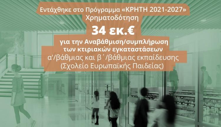 Σε μια σημαντική πρωτοβουλία για την αναβάθμιση των εκπαιδευτικών υποδομών της Κρήτης προχωρά η Περιφέρεια, με την έκδοση πρόσκλησης για την ανέγερση του νέου Σχολείου Ευρωπαϊκής Παιδείας στο Ηράκλειο. Η δημόσια δαπάνη που διατίθεται για το έργο ανέρχεται σε 34.000.000,00€ και καλύπτεται από το Πρόγραμμα «Κρήτη» 2021-2027 με τη συγχρηματοδότηση του Ευρωπαϊκού Ταμείου Περιφερειακής Ανάπτυξης (ΕΤΠΑ).