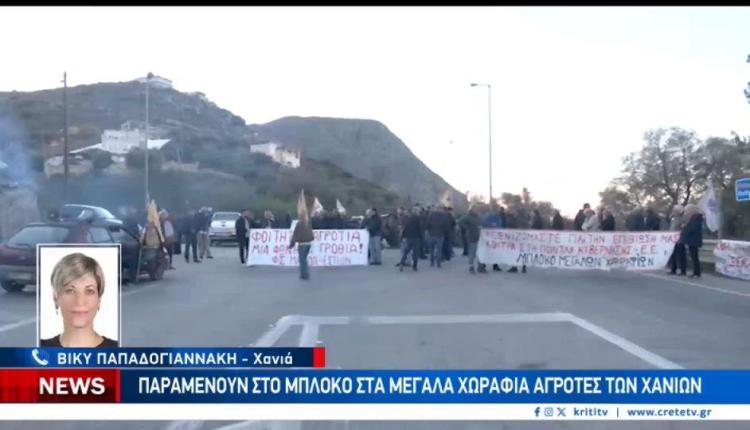 Παραμένουν στο μπλόκο στα Μεγάλα Χωράφια οι αγρότες των Χανίων, οι οποίοι συντονίζουν τις δράσεις τους με τις αποφάσεις της πανελλαδικής επιτροπής μπλόκων. Νωρίς το απόγευμα προχώρησαν σε συμβολικό αποκλεισμό του Βόρειου Οδικού Άξονα, ενώ εντός των ημερών αναμένεται να αποφασίσουν για το μέλλον του αγώνα τους.