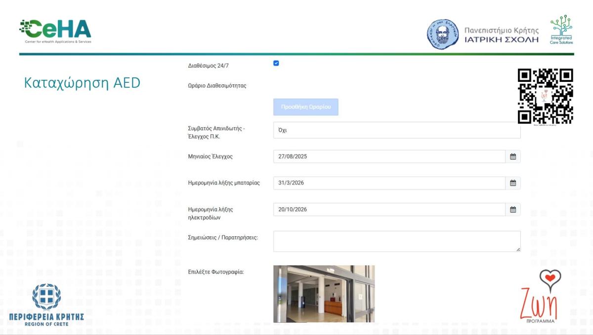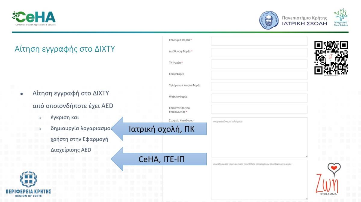 Η Περιφέρεια Κρήτης σε συνεργασία με το Εργαστήριο Καρδιοπνευμονικής Αναζωογόνησης της Ιατρικής Σχολής του Πανεπιστημίου Κρήτης και το Κέντρο Εφαρμογών και Υπηρεσιών Ηλεκτρονικής Υγείας (CeHA), του ΙΤΕ–ΙΠ παρουσιάζει τα «βήματα» για την ορθή εγγραφή και διαχείριση απινιδωτών (AED) από ιδιωτικούς και δημόσιους φορείς στην ψηφιακή εφαρμογή ΔΙΧΤΥ (https://apinidotes.crete.gov.gr/OrgRegistrationForm ).