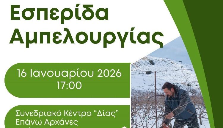 Εσπερίδα με θέμα την Αμπελουργία διοργανώνει το Δίκτυο Οινοποιών Κρήτης, με την υποστήριξη της Περιφέρειας Κρήτης, την Παρασκευή 16 Ιανουαρίου 2026 στις 17:00, στο Συνεδριακό Κέντρο «Δίας» στις Αρχάνες Ηρακλείου.