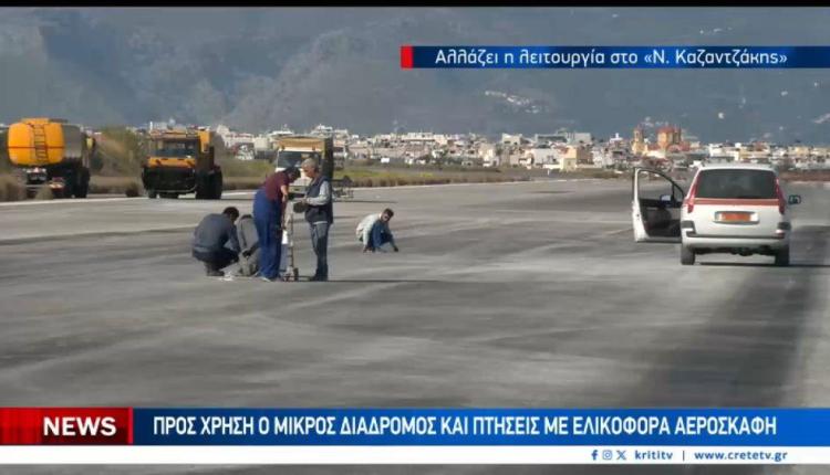 Ξεκινούν αύριο και για μια εβδομάδα προγραμματισμένες εργασίες συντήρησης στον κεντρικό διάδρομο προσγειώσεων και απογειώσεων του αεροδρομίου «Νίκος Καζαντζάκης». Οι πτήσεις θα εξυπηρετούνται με περιορισμένο ωράριο και μόνο με ελικοφόρα αεροσκάφη από τον μικρό διάδρομο. Η πλήρης λειτουργία του αεροδρομίου αναμένεται να αποκατασταθεί το πρωί της Δευτέρας 26 Ιανουαρίου.