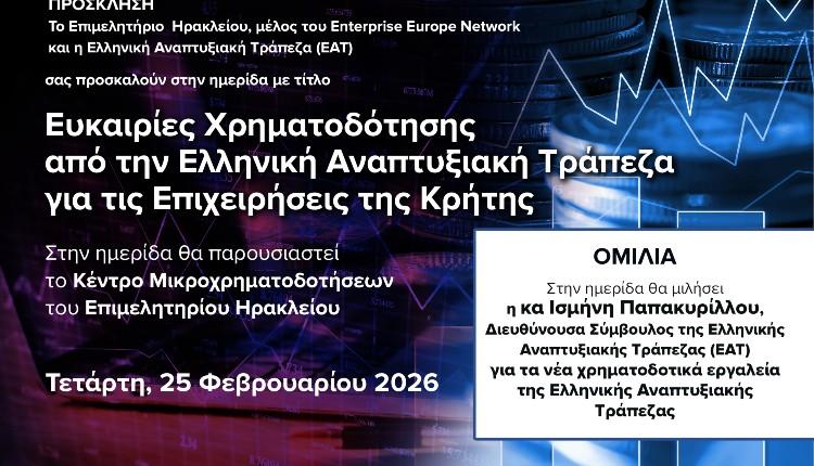 Το Επιμελητήριο Ηρακλείου – μέλος του Enterprise Europe Network – και η Ελληνική Αναπτυξιακή Τράπεζα (ΕΑΤ) διοργανώνουν ημερίδα με θέμα «Ευκαιρίες χρηματοδότησης από την Ελληνική Αναπτυξιακή Τράπεζα για τις επιχειρήσεις της Κρήτης».
