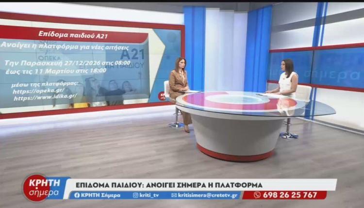 Άνοιξε σήμερα στις 08:00 η ηλεκτρονική πλατφόρμα Α21-Επίδομα Παιδιού για την υποβολή αιτήσεων έτους 2026, σύμφωνα με το υπουργείο Κοινωνικής Συνοχής και Οικογένειας και τον ΟΠΕΚΑ. Η πλατφόρμα θα παραμείνει ανοιχτή και θα δέχεται νέες αιτήσεις έως τις 11 Μαρτίου 2026 και ώρα 18:00.