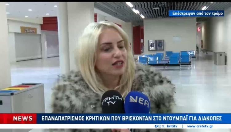 31 κρητικές που βρίσκονταν στο Ντουμπάι για διακοπές με ταξιδιωτικό γραφείο των Χανίων, επαναπατρίστηκαν χθες με πτήση της AirArabia. Κατά την άφιξή τους στο αεροδρόμιο Δασκαλογιάννης μετέφεραν την εμπειρία τους, κάνοντας λόγο για πρωτόγνωρη κατάσταση, και εξηγώντας ότι λόγο της συνεχούς επικοινωνίας με το ελληνικό προξενείο και το Υπουργείο Εξωτερικών, δεν κυριάρχησε φόβος, ακόμη κι όταν το Ιρανικό ντρόουν χτύπησε το Αμερικανικό προξενείο στο Ντουμπάι.