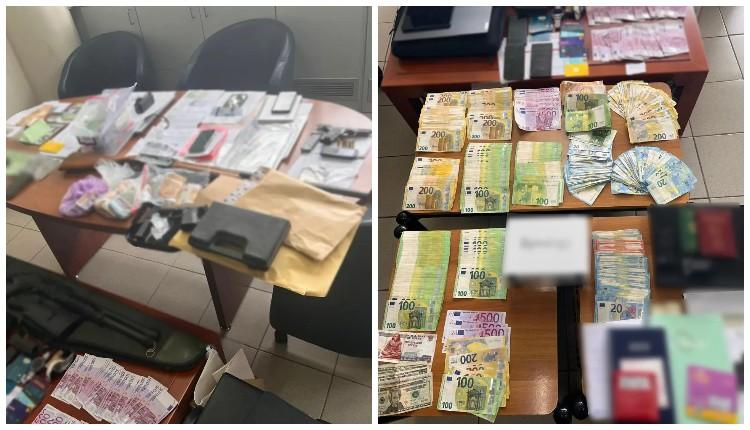 Κατά τις έρευνες σε σπίτια, καταστήματα και επιχειρήσεις, οι αστυνομικοί εντόπισαν και κατέσχεσαν, μεταξύ άλλων, δύο πιστόλια, 55 φυσίγγια, πέντε φυσίγγια κρότου αερίου, μία μονόκαννη καραμπίνα χωρίς άδεια, 19 κινητά τηλέφωνα, οκτώ φορητούς υπολογιστές, τρία καταγραφικά, τέσσερις συσκευές αποθήκευσης δεδομένων, δύο smart watch, πλήθος τραπεζικών καρτών και βιβλιαρίων αλλοδαπών, μπλοκ επιταγών, πλαστή άδεια οδήγησης, δεκάδες έγγραφα μετακλήσεων και πληρωμών, τρία Ι.Χ.Ε., μία μοτοσικλέτα και το ποσό των 202.170 ευρώ.