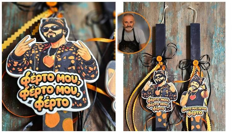 Ο δάσκαλος ζωγραφικής και δημιουργός χειροποίητων κατασκευών και δώρων πρόσθεσε στη φετινή συλλογή των πασχαλινών λαμπάδων του και μία ξεχωριστή πρόταση με τη μορφή του 27χρονου τραγουδοποιού Ακύλα Μυτιληναίου, ο οποίος κατάγεται από τις Σέρρες και θα εκπροσωπήσει φέτος την Ελλάδα στη Eurovision της 16ης Μαΐου στη Βιέννη της Αυστρίας με το τραγούδι «Ferto».