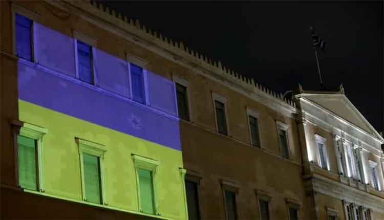 Η Βουλή των Ελλήνων φωταγωγείται με τη σημαία της Ουκρανίας