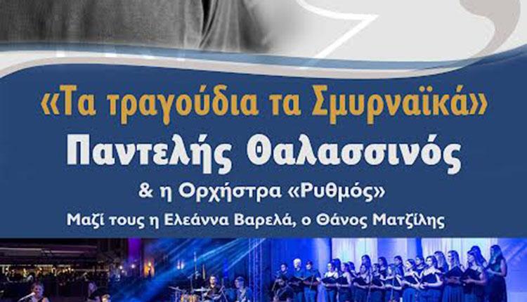 «Τα τραγούδια τα Σμυρναίικα», είναι ο τίτλος της συναυλίας με τον δημοφιλή ερμηνευτή και συνθέτη Παντελή Θαλασσινό που θα πραγματοποιηθεί στα πλαίσια του Φεστιβάλ Κρήτης με διοργανωτή την Περιφέρεια Κρήτης και με ελεύθερη είσοδο στους πολίτες, την Παρασκευή 29 Ιουλίου στις 9:30 μμ στη Ιερά Μονή της Παναγίας Γκουβερνιώτισσας, στις Ποταμιές Πεδιάδος του Δήμου Χερσονήσου.
