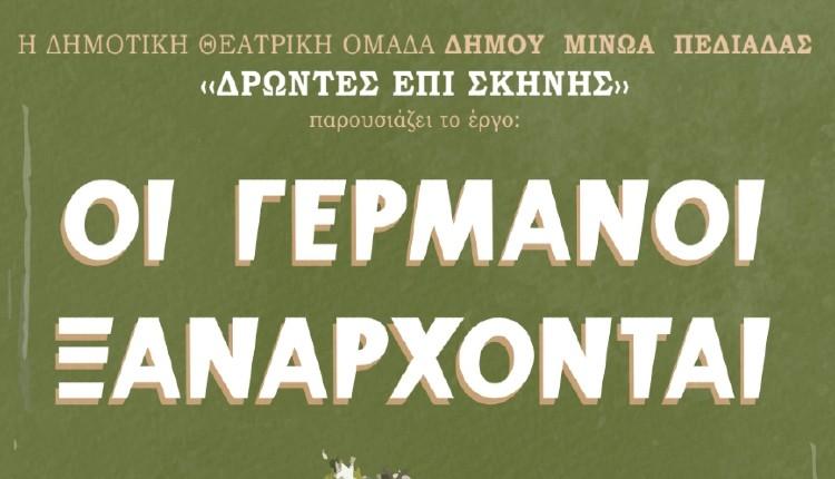 Με την συνδιοργάνωση της Περιφέρειας Κρήτης και την στήριξη του Δήμου Μινώα Πεδιάδας-ΔΟΠΑΠ η Θεατρική Ομάδα του Δήμου Μίνωα Πεδιάδας «Δρώντες Επί Σκηνής» παρουσιάζει την κωμωδία των Σακελλάριου-Γιαννακόπουλου «Οι Γερμανοί ξανάρχονται» σε σκηνοθεσία της Ευαγγελίας Μαρκοπούλου.